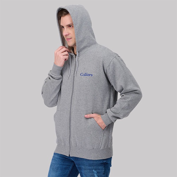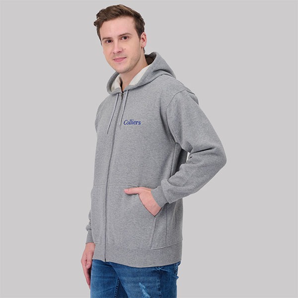 BLENDED COTTON FULL ZIPPER SWEAT SHIRT WITH HOOD AND POCKETS. GREY MELANGE FABRIC WITH COLLIERS LOGO EMBROIDERED